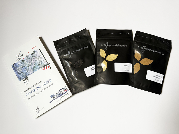 In questo box trovate: lo zenzero, il coriandolo e il pepe nero con un'elegante cartellina nera che raccoglie ricette e suggerimenti d'uso, unitamente al libro "Fantasmi cinesi".
