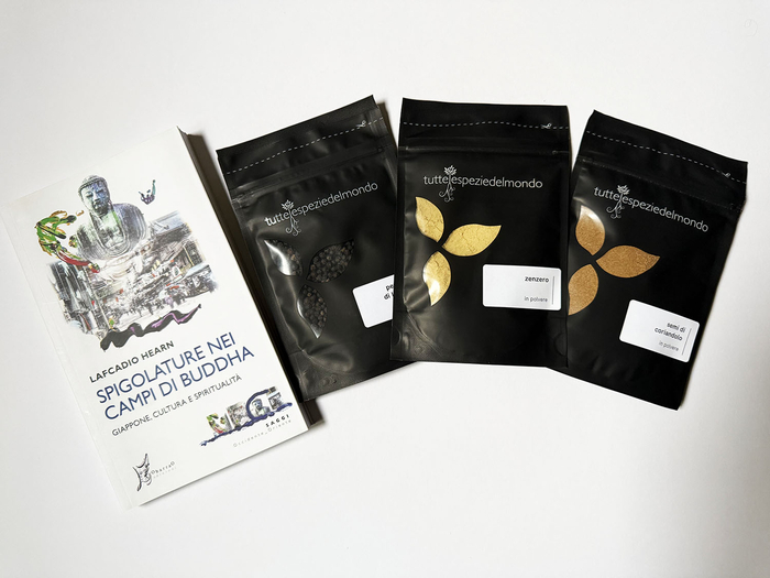 In questo box trovate: il mix di pepe giapponese e il curry giapponese con un'elegante cartellina nera che raccoglie ricette e suggerimenti d'uso, unitamente al libro " Spigolature dei campi di Buddha".
